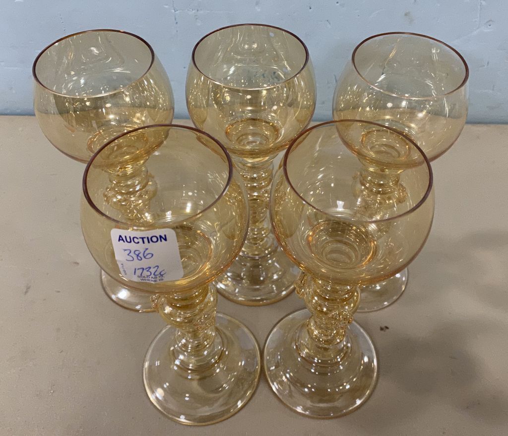 Five Amber Art Glass Goblets, hand blown, 7 1/2"h. Five Amber Art Glass Goblets, hand blown, 7 1/2"h.