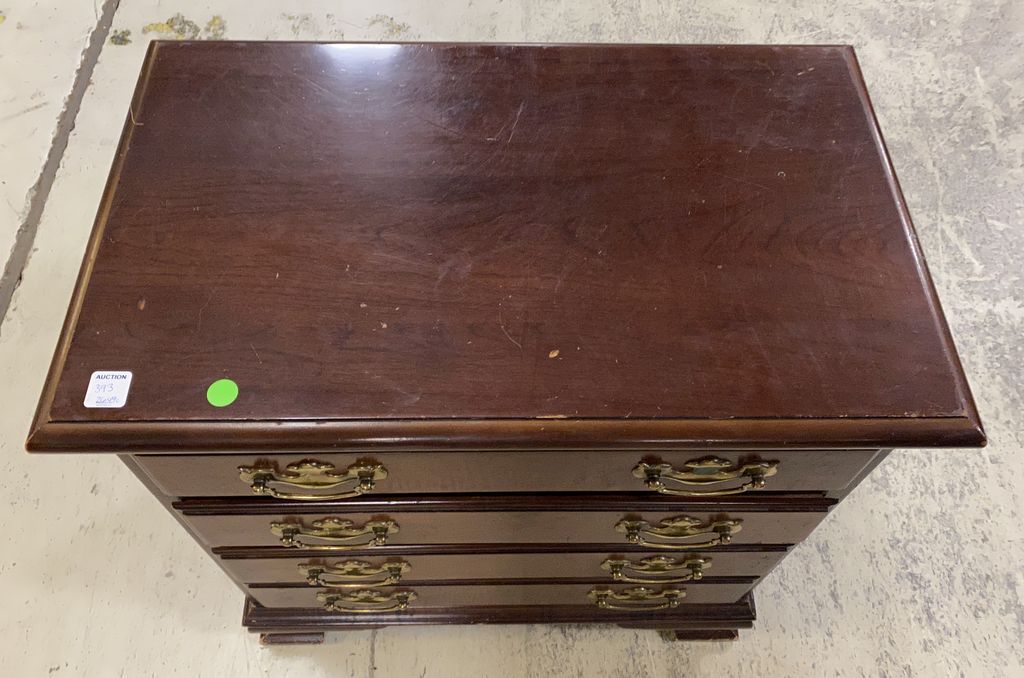 Reproduction Cherry Chippendale Night Stand, brass pulls & handes, four drawers, has finish wear, scratches, 24"h., 24"w., 15"d. Reproduction Cherry Chippendale Night Stand, brass pulls & handes, four drawers, has finish wear, scratches, 24"h., 24"w., 15"d.