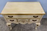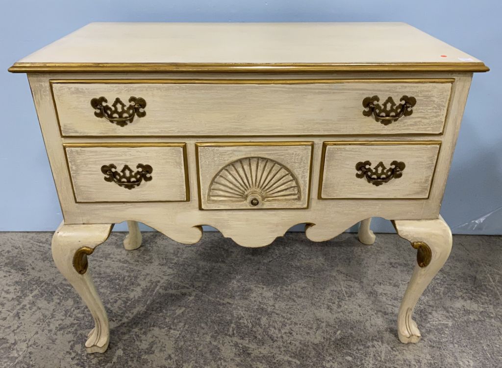 Ethan Allen Painted Low Boy, four drawers, white and gold painted, good condition, 32"h., 37"w., 19"d. Ethan Allen Painted Low Boy, four drawers, white and gold painted, good condition, 32"h., 37"w., 19"d.