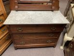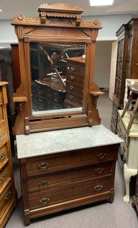 Antique Victorian Style Marble Top Dresser, craved designs, three drawers, Italian Marble, candle stands, mirrored, on casters, light wear, 80"h., 40"w., 18"d. Antique Victorian Style Marble Top Dresser, craved designs, three drawers, Italian Marble, candle stands, mirrored, on casters, light wear, 80"h., 40"w., 18"d.