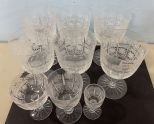 9 Etched Crystal Stems, wine glasses 6"h., three small stems, good condition. 9 Etched Crystal Stems, wine glasses 6"h., three small stems, good condition.
