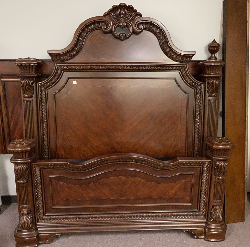 Modern Cherry Ornate Queen Size Bed, crest, heavy, wood rails, light wear, store bought. Modern Cherry Ornate Queen Size Bed, crest, heavy, wood rails, light wear, store bought.