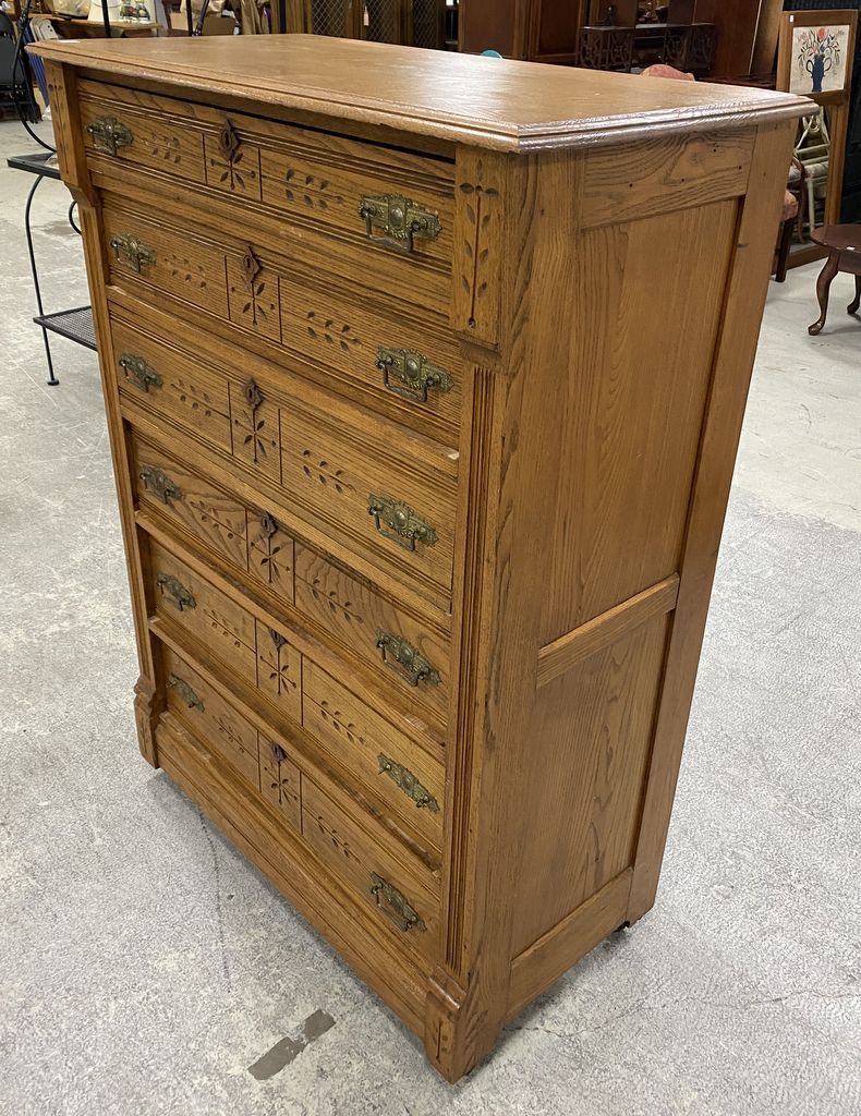 Victorian Style Oak Chest of Drawers, carved designs, 6 drawers, on wheels, 53"h., 38"w., 18"d. Victorian Style Oak Chest of Drawers, carved designs, 6 drawers, on wheels, 53"h., 38"w., 18"d.