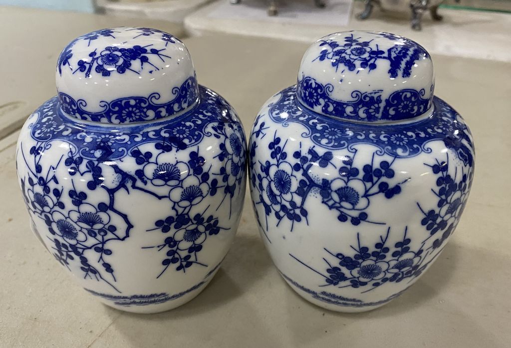 Small Pair of Ginger Jars, blue and white porcelain, not hand painted, with lids, 5"h. Small Pair of Ginger Jars, blue and white porcelain, not hand painted, with lids, 5"h.