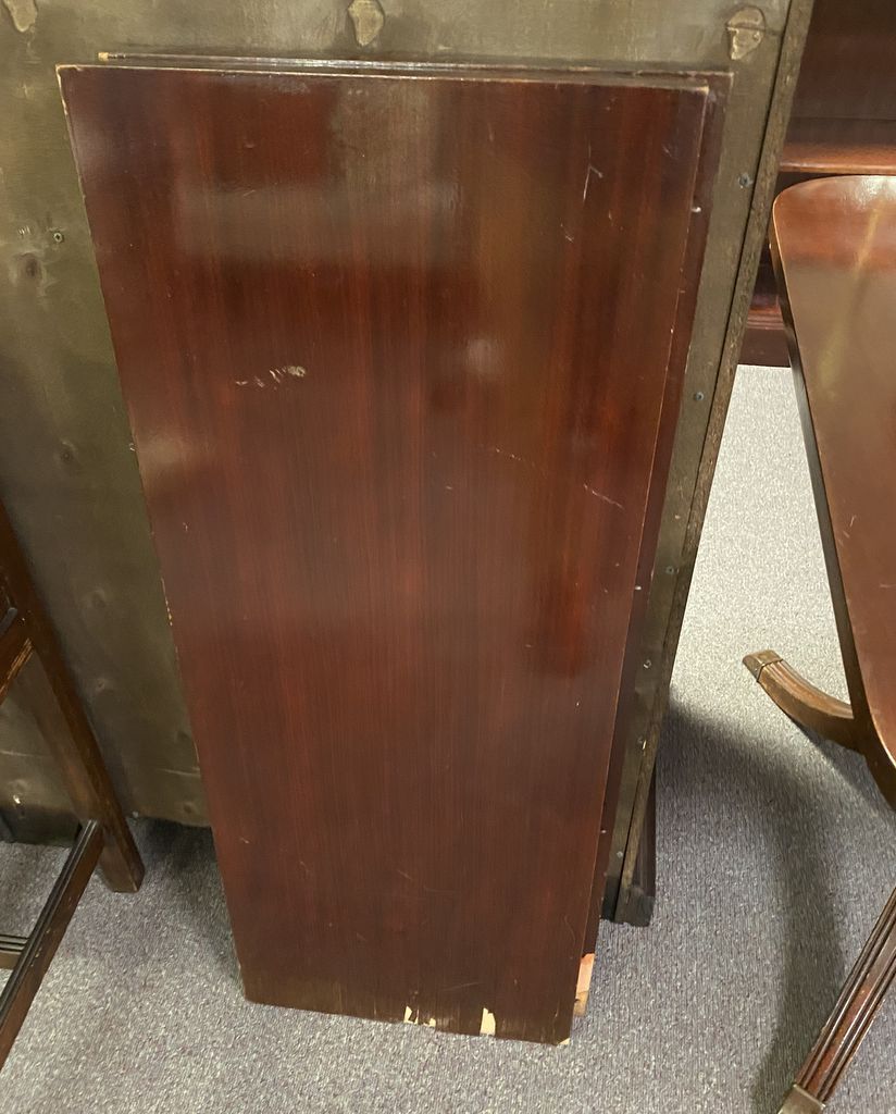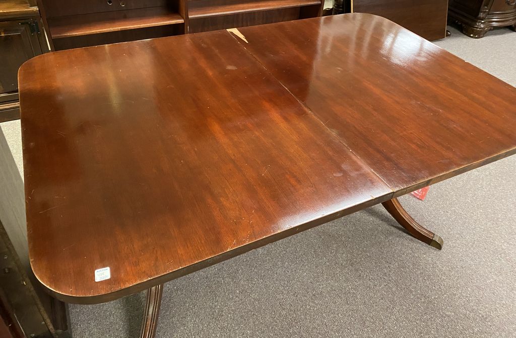 Duncan Phyfe Cherry Double Pedestal Table, has veneer damage on top and on the two leaves, finish has wear, 30"h., 62"long., 42"w. Duncan Phyfe Cherry Double Pedestal Table, has veneer damage on top and on the two leaves, finish has wear, 30"h., 62"long., 42"w.