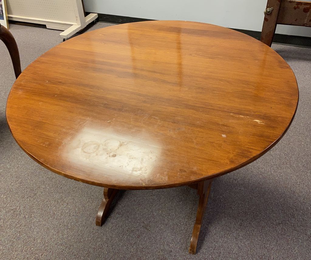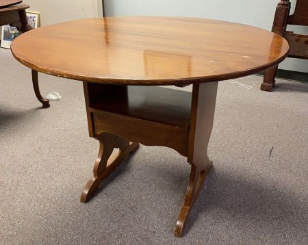 Reproduction cherry hutch table, bench pedestal, top lifts to sitting bench, good condition, includes glass top. Reproduction cherry hutch table, bench pedestal, top lifts to sitting bench, good condition, includes glass top.