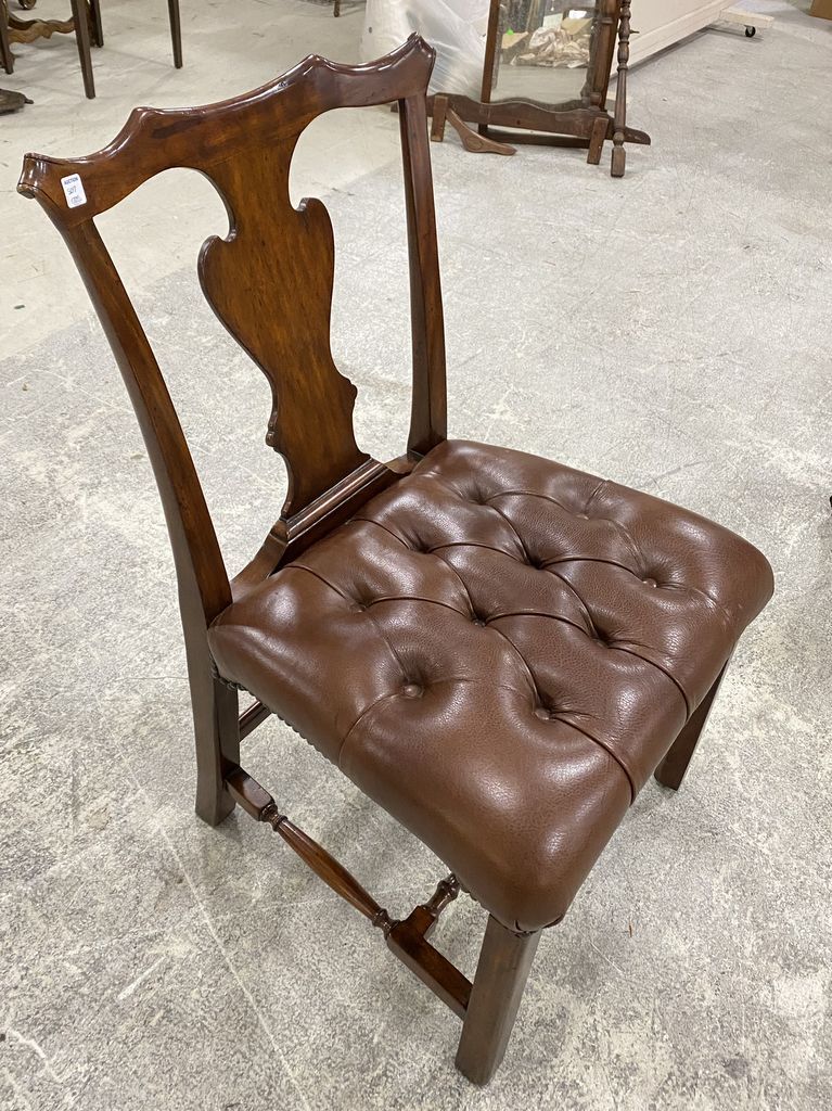 Antique Reproduction Mahogany Side Chair, brown leather button tufted cushion, good condition, 39"h., 24"w. Antique Reproduction Mahogany Side Chair, brown leather button tufted cushion, good condition, 39"h., 24"w.