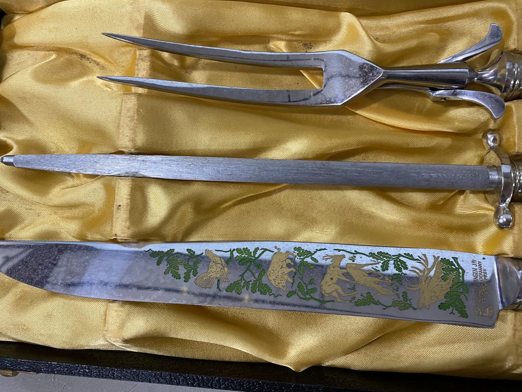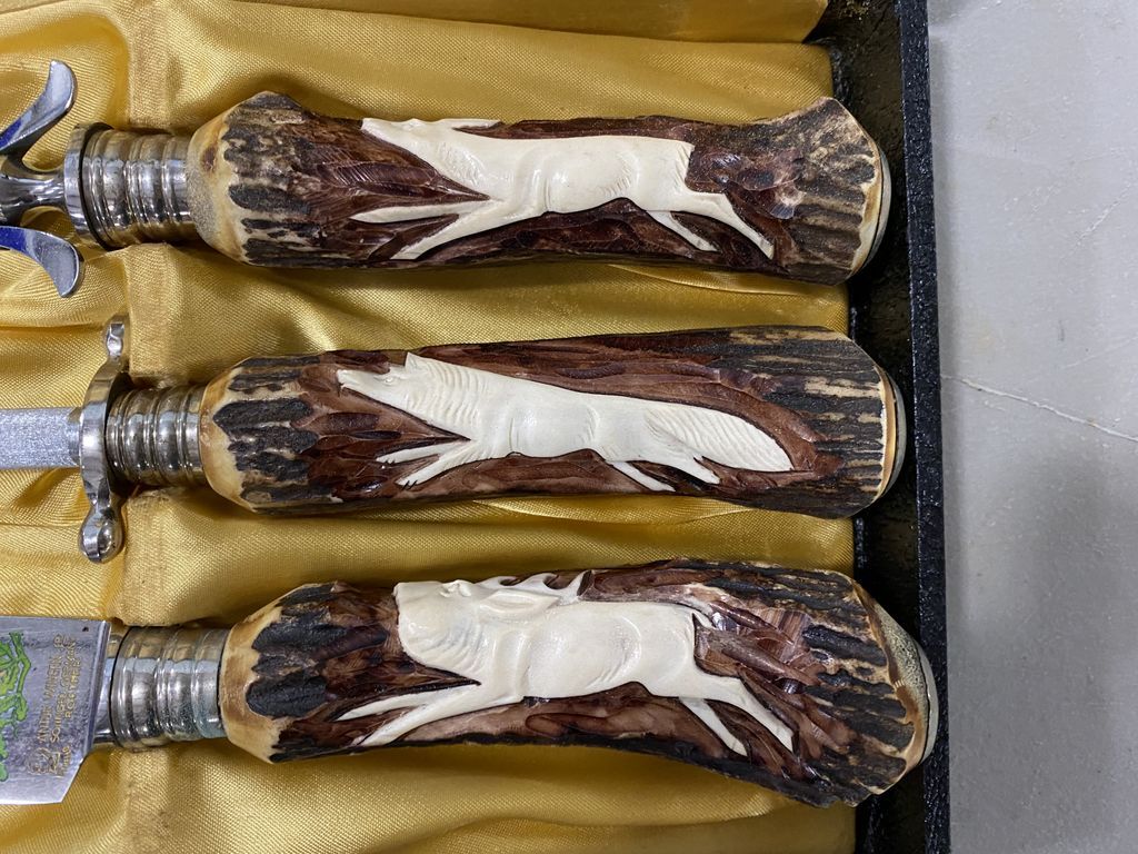 Anton Wingen Jr Solingen Carving Set, carved antler handled of stag, light rust on blades, 13". Anton Wingen Jr Solingen Carving Set, carved antler handled of stag, light rust on blades, 13".