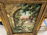 Large Courtyard Painting On Canvas, gold gilt framed, canvas is loose from frame, 46"h., 34"w. Large Courtyard Painting On Canvas, gold gilt framed, canvas is loose from frame, 46"h., 34"w.