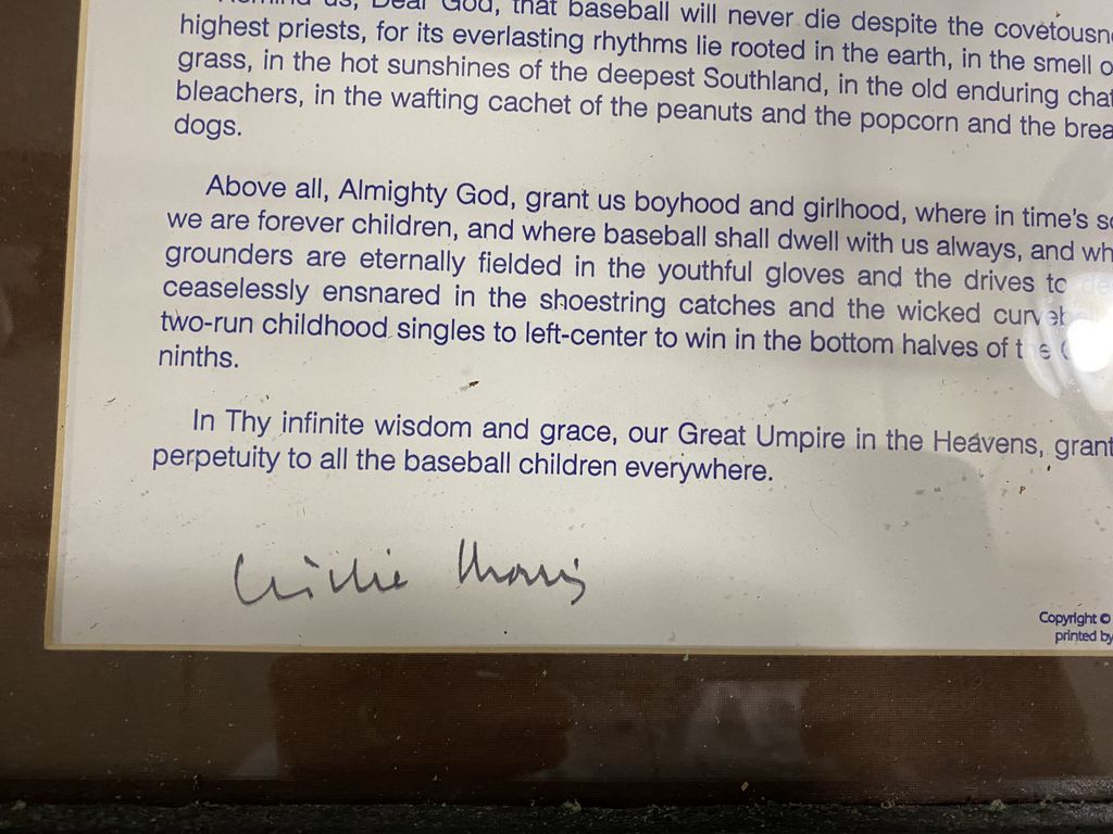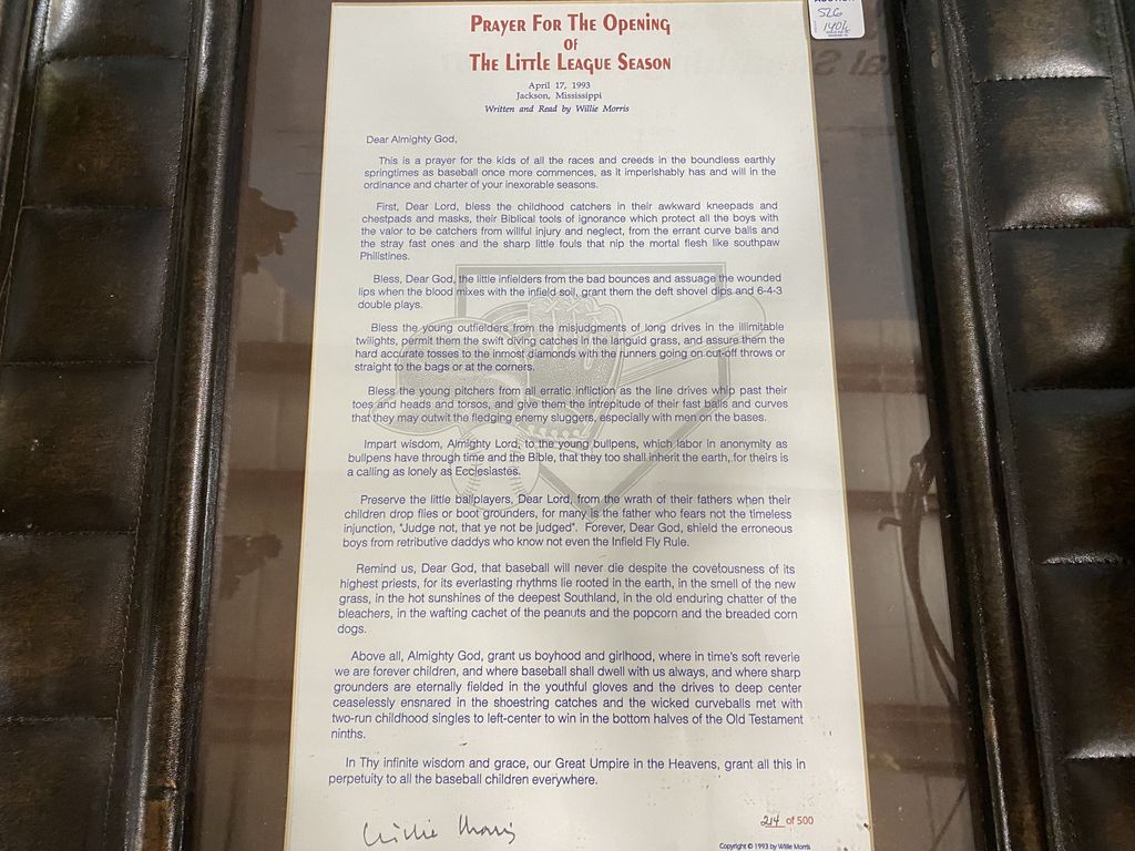 Signed Willie Morris Prayer for little League Season, numbered 214/500, framed, 27"h., 22"w. Signed Willie Morris Prayer for little League Season, numbered 214/500, framed, 27"h., 22"w.