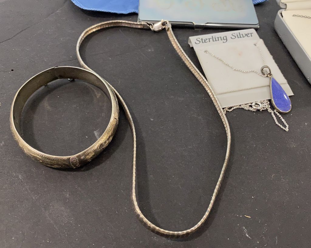 Silver plate card holder, monogrammed, silver plate heart pendant, two sterling necklaces, .925 necklace, sterling bangle bracelet. Silver plate card holder, monogrammed, silver plate heart pendant, two sterling necklaces, .925 necklace, sterling bangle bracelet.