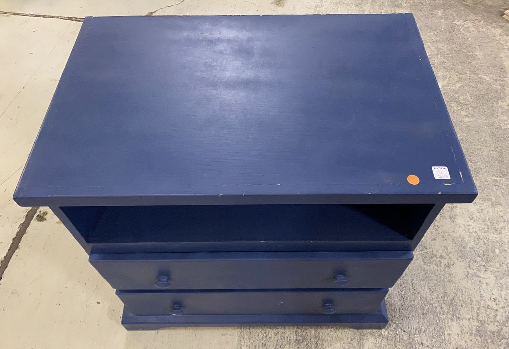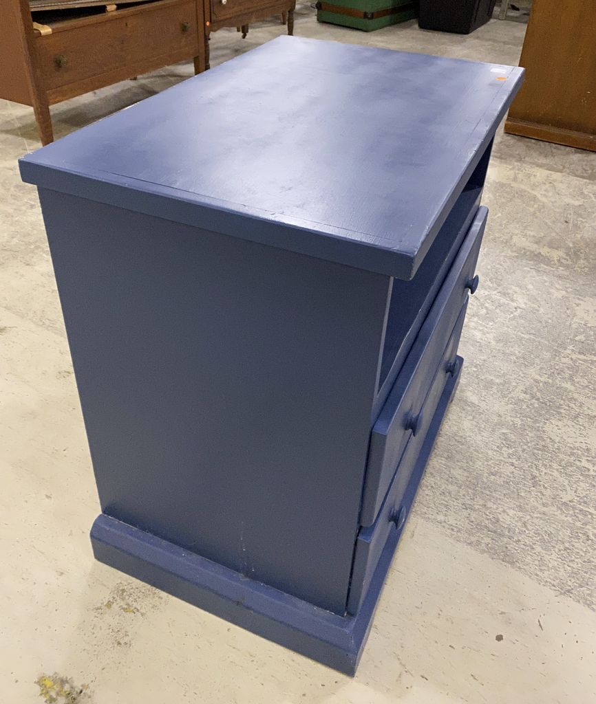 Modern Painted Blue TV Stand, two drawer, open top storage, used condition, 30"h., 30"w., 19"d. Modern Painted Blue TV Stand, two drawer, open top storage, used condition, 30"h., 30"w., 19"d.