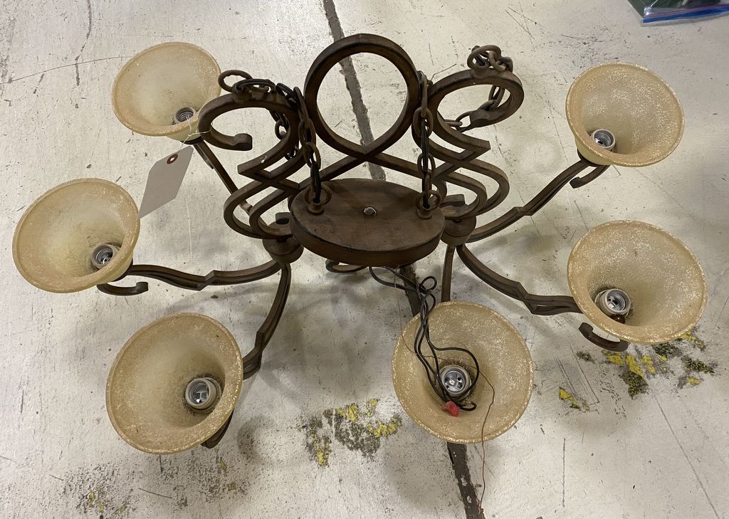Large Metal Decorative Light Fixture, 5 arm with glass shades, used, good condition 24"h., 39"w. Large Metal Decorative Light Fixture, 5 arm with glass shades, used, good condition 24"h., 39"w.