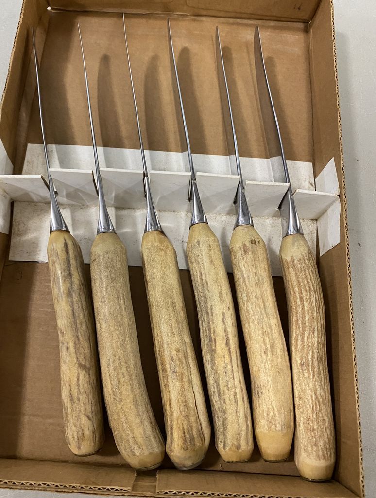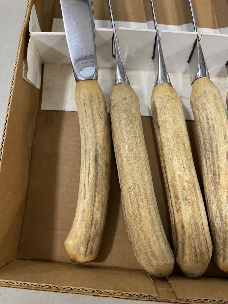 6 Stainless Steel Horn Handled Dinner Knives, good condition, 9", in box. 6 Stainless Steel Horn Handled Dinner Knives, good condition, 9", in box.