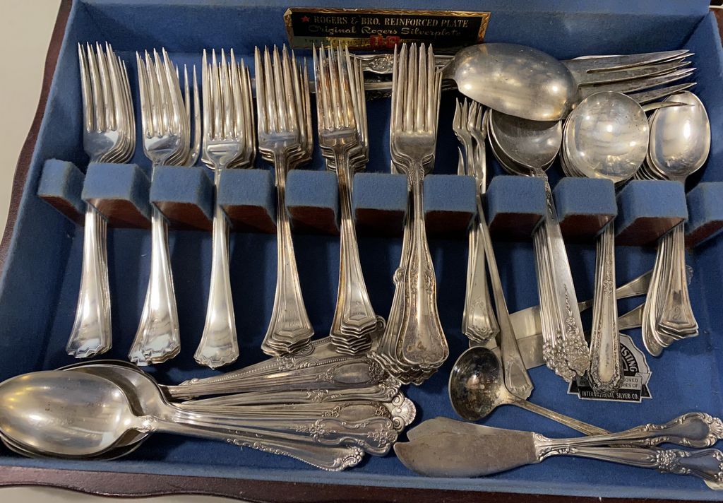 Group of Assorted styles silver plate flatware, 98 total pieces, forks, spoons, knives. Group of Assorted styles silver plate flatware, 98 total pieces, forks, spoons, knives.
