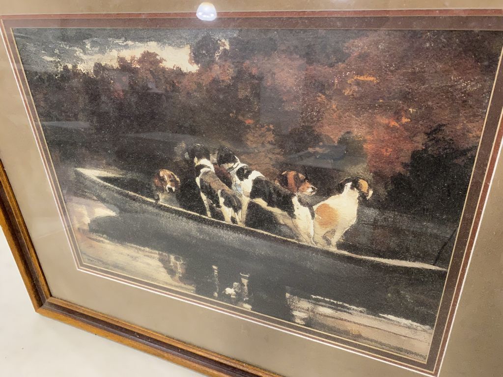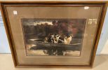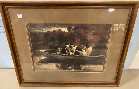 Home Dogs in Boat Print of original painting, matted, framed, 26"h., 31"w. Home Dogs in Boat Print of original painting, matted, framed, 26"h., 31"w.