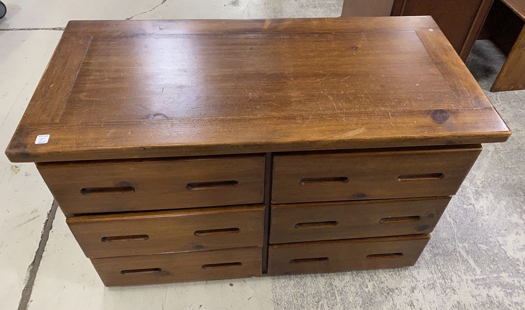 Modern Pine Double Dresser, 6 drawers, light wear, 28"h., 45"w., 21"d. Modern Pine Double Dresser, 6 drawers, light wear, 28"h., 45"w., 21"d.