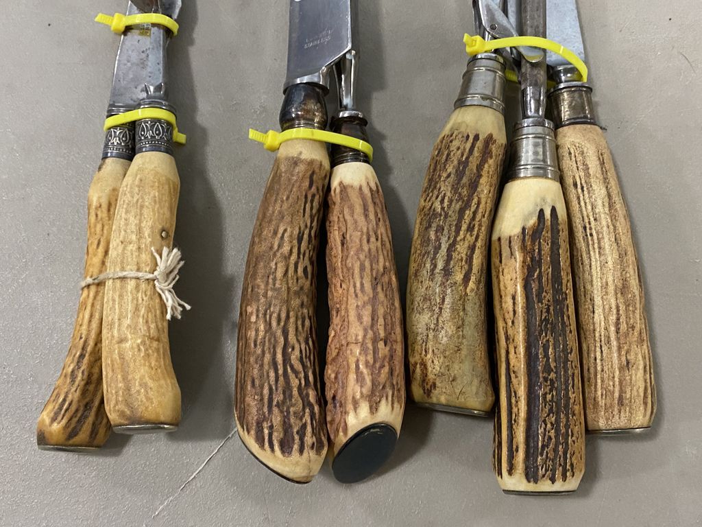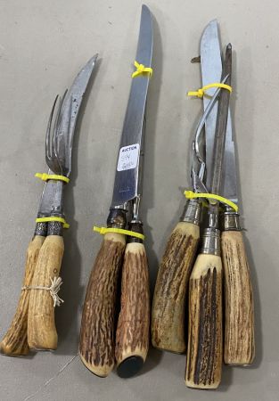 Three Antler Carving Sets, Russel Stainless, 7 total, used condition. Three Antler Carving Sets, Russel Stainless, 7 total, used condition.
