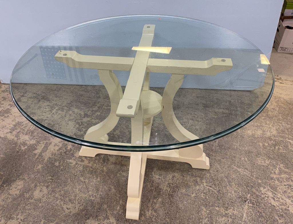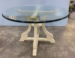Modern Wood Pedestal Base Glass Table, 48"dia., 30"h. Modern Wood Pedestal Base Glass Table, 48"dia., 30"h.
