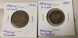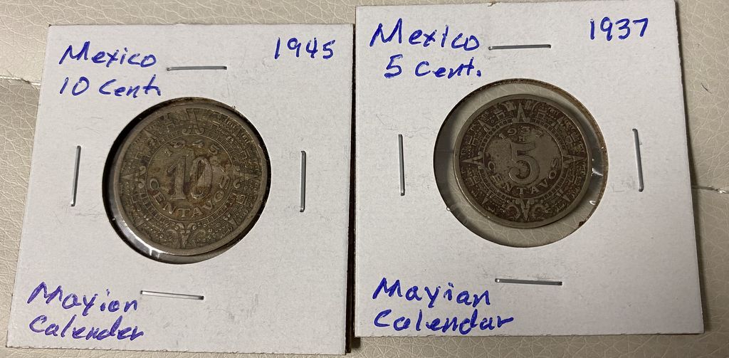 1945 19 Centavos and 1937 5 Centavos, Mexico Mayan Calendar, paper cases. 1945 19 Centavos and 1937 5 Centavos, Mexico Mayan Calendar, paper cases.