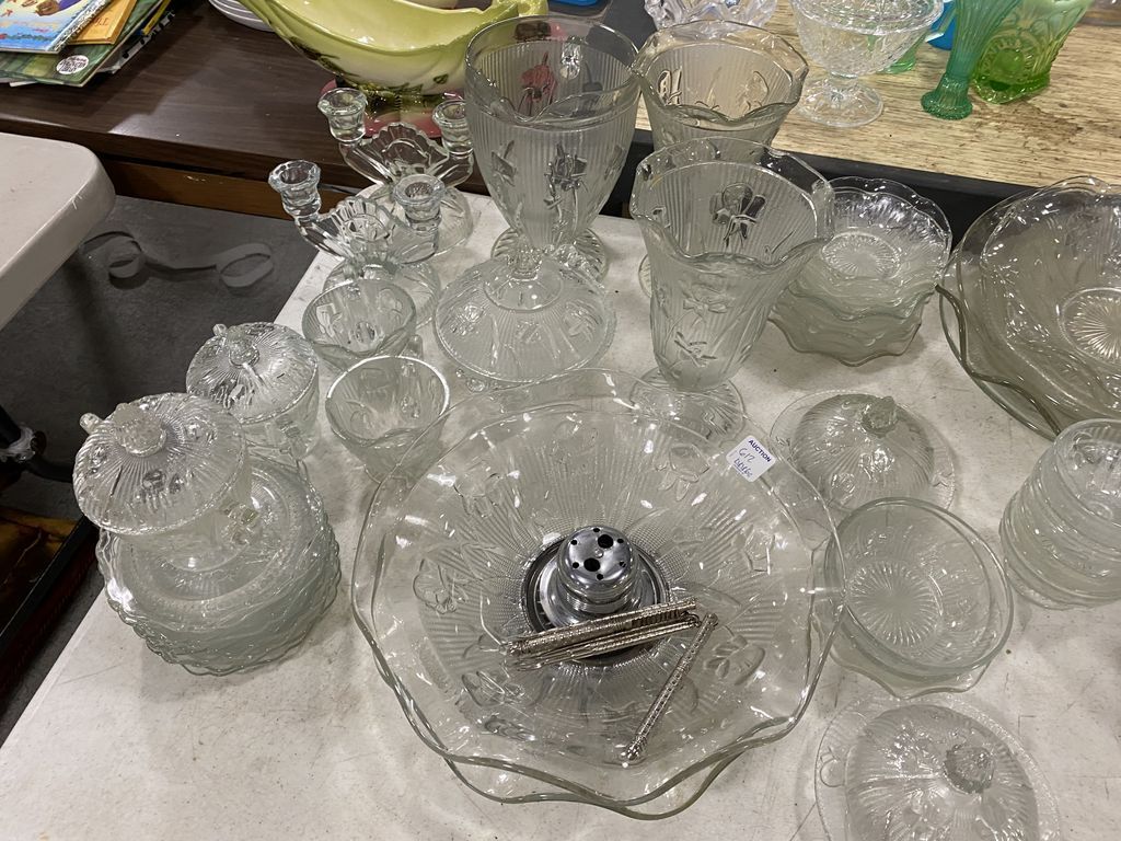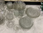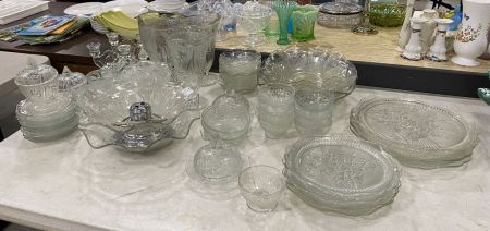 Large Group of Jeannette Iris Serving Glassware, charges, plates, bowls, berry bowls, pitcher, vases, candle holders, sugar and creamers, cheese dome. Large Group of Jeannette Iris Serving Glassware, charges, plates, bowls, berry bowls, pitcher, vases, candle holders, sugar and creamers, cheese dome.