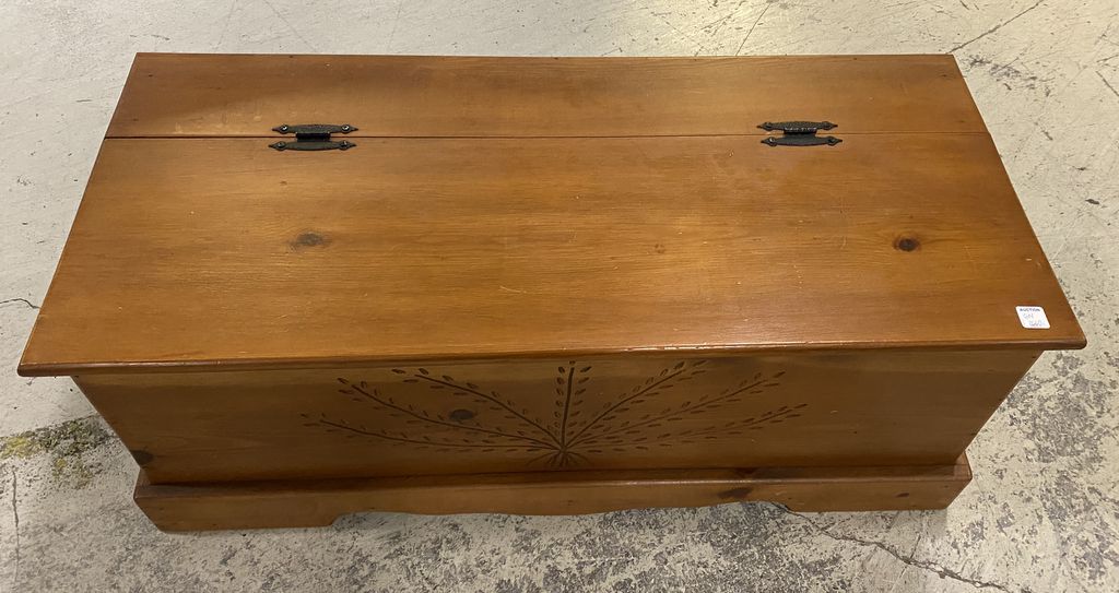 Pine Lift Top Trunk, lift top, wheat design, good condition, 14"h., 37"w. Pine Lift Top Trunk, lift top, wheat design, good condition, 14"h., 37"w.