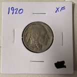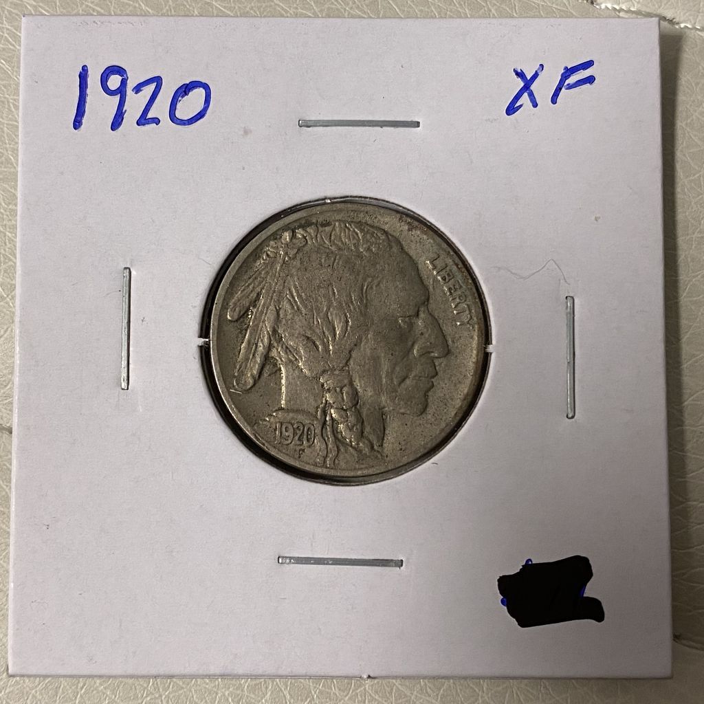 1920 Buffalo Nickel XF, paper case. 1920 Buffalo Nickel XF, paper case.