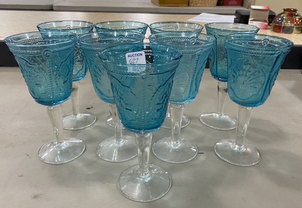 9 Blue glass stemware goblets, pressed design, 7 1/2"h. 9 Blue glass stemware goblets, pressed design, 7 1/2"h.