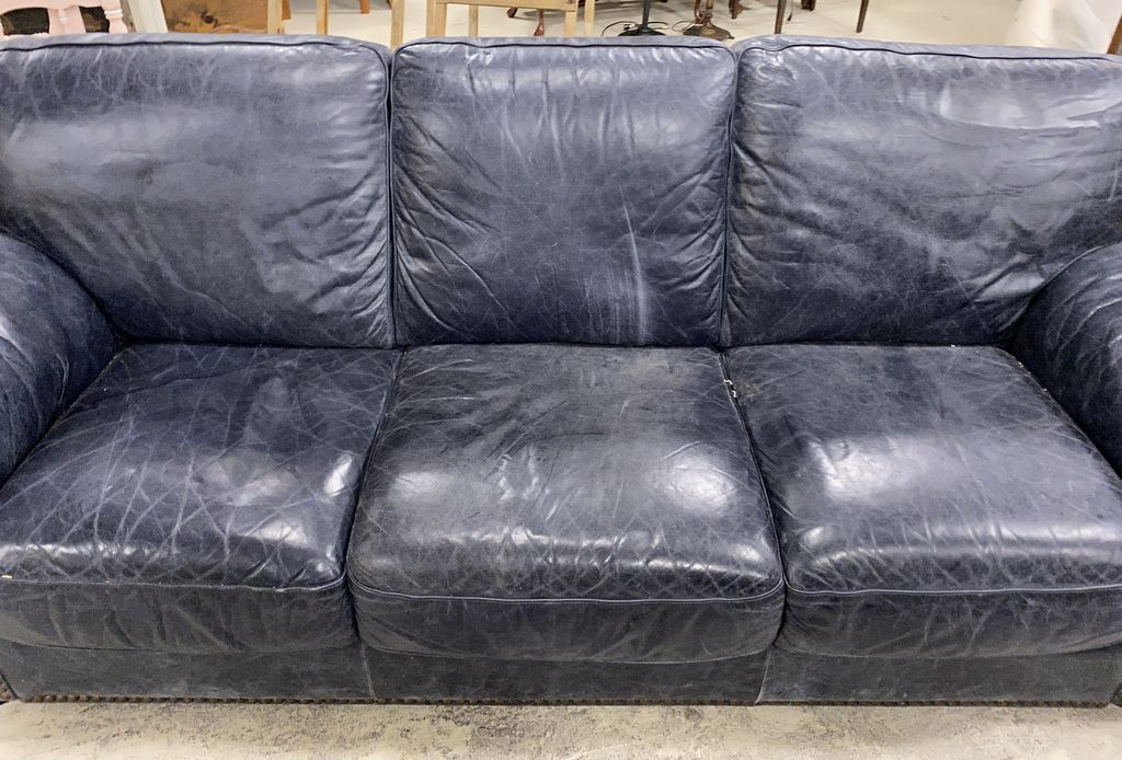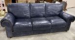 Large Blue Leather Three Cushion Sofa, age crackling, used condition, 7'4 Large Blue Leather Three Cushion Sofa, age crackling, used condition, 7'4