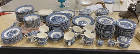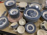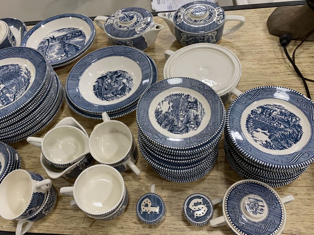 Currier & Ives "The Old Grist Mill" Blue and White Pottery, large set, dinner plates, bowls, cups, berry bowls, bread & butter plates, creamer, tureen, platter, butter dish. Currier & Ives "The Old Grist Mill" Blue and White Pottery, large set, dinner plates, bowls, cups, berry bowls, bread & butter plates, creamer, tureen, platter, butter dish.
