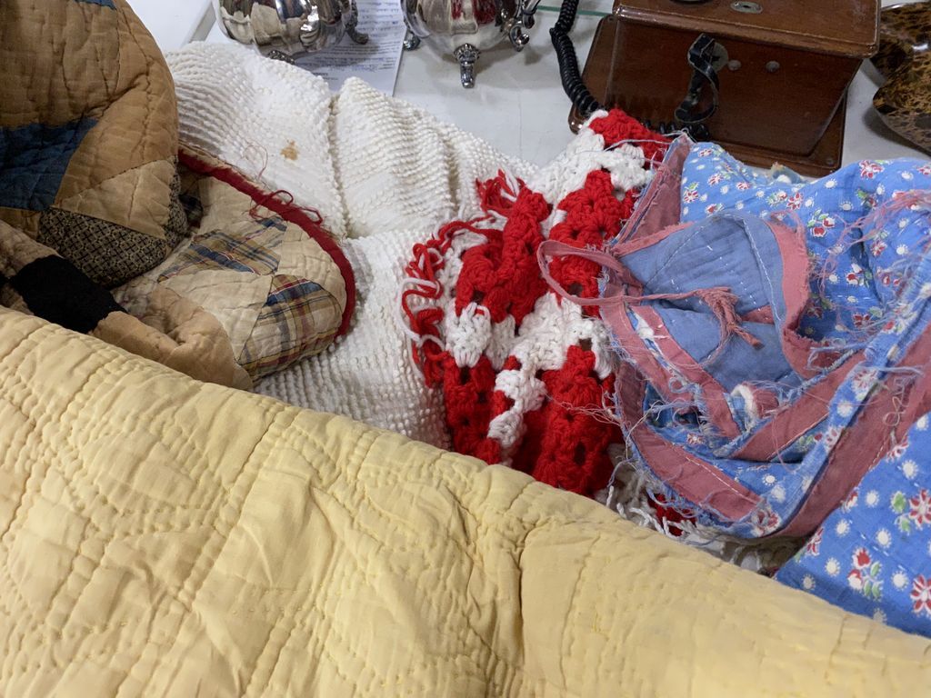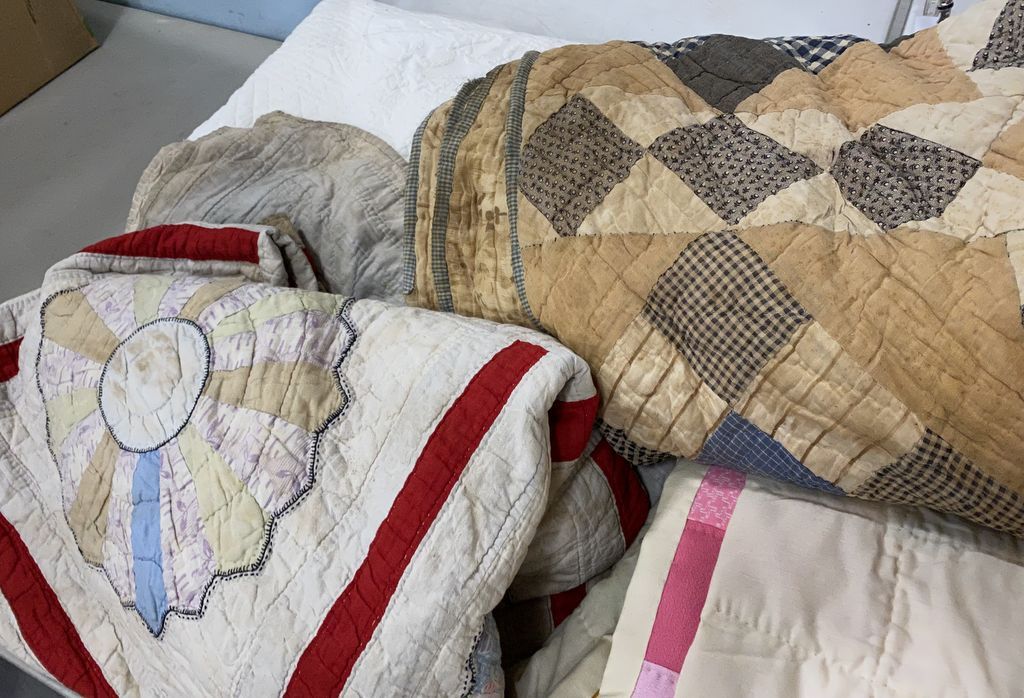 Group of Hand Crafted Quilts, different styles, patchworks, some are dirty. Group of Hand Crafted Quilts, different styles, patchworks, some are dirty.