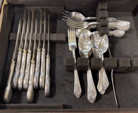 Tw Partial sets of silver plate flatware, "Oneida" 14 teaspoons, 8 table spoons, 8 knives, 6 forks, butter knife. Alvin SP 7 Forks, 8 Knives, 6 teaspoons, meat fork, soup spoon. Tw Partial sets of silver plate flatware, "Oneida" 14 teaspoons, 8 table spoons, 8 knives, 6 forks, butter knife. Alvin SP 7 Forks, 8 Knives, 6 teaspoons, meat fork, soup spoon.