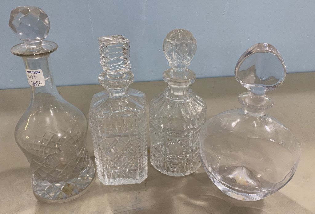 Four Pressed Glass Decanters, different styles, with stoppers, 12"h. Four Pressed Glass Decanters, different styles, with stoppers, 12"h.
