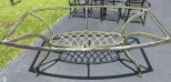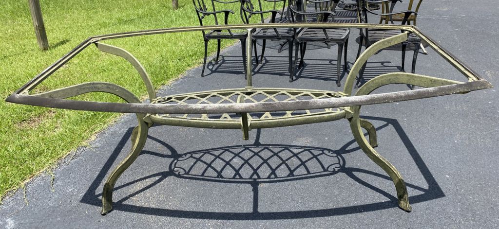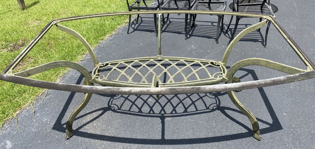 Metal Outdoor Patio Table, weathered condition, missing glass top, included umbrella. Metal Outdoor Patio Table, weathered condition, missing glass top, included umbrella.