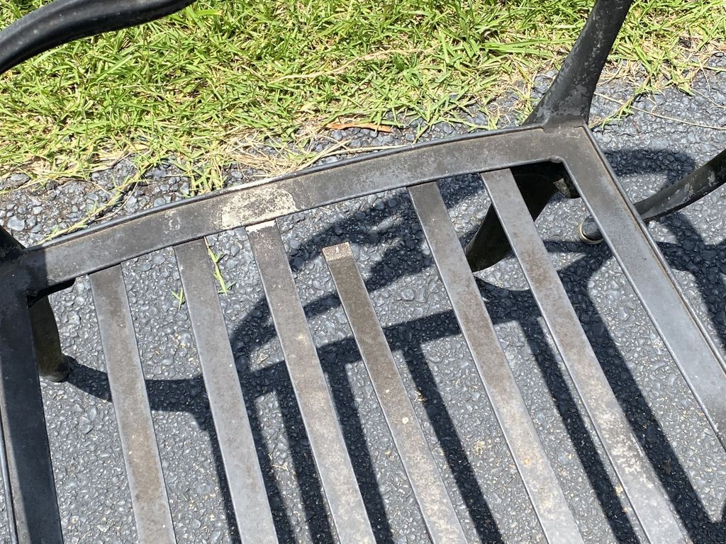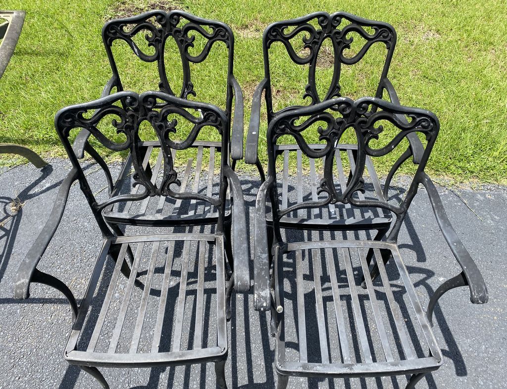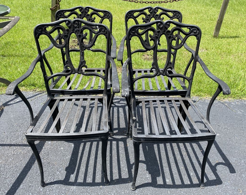 Four Cast Iron Outdoor Chairs, arms, weathered, has one broken seat. Four Cast Iron Outdoor Chairs, arms, weathered, has one broken seat.
