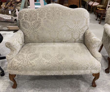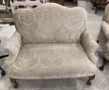 Ball-n-Claw Upholstered Settee, floral pattern, camel back, good condition, 48"w. Ball-n-Claw Upholstered Settee, floral pattern, camel back, good condition, 48"w.