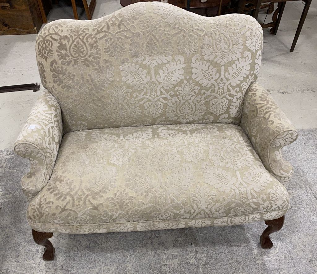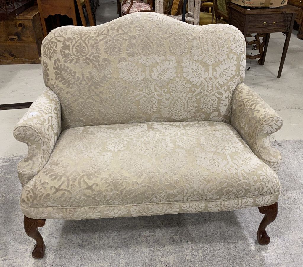 Ball-n-Claw Upholstered Settee, floral pattern, camel back, good condition, 48"w. Ball-n-Claw Upholstered Settee, floral pattern, camel back, good condition, 48"w.