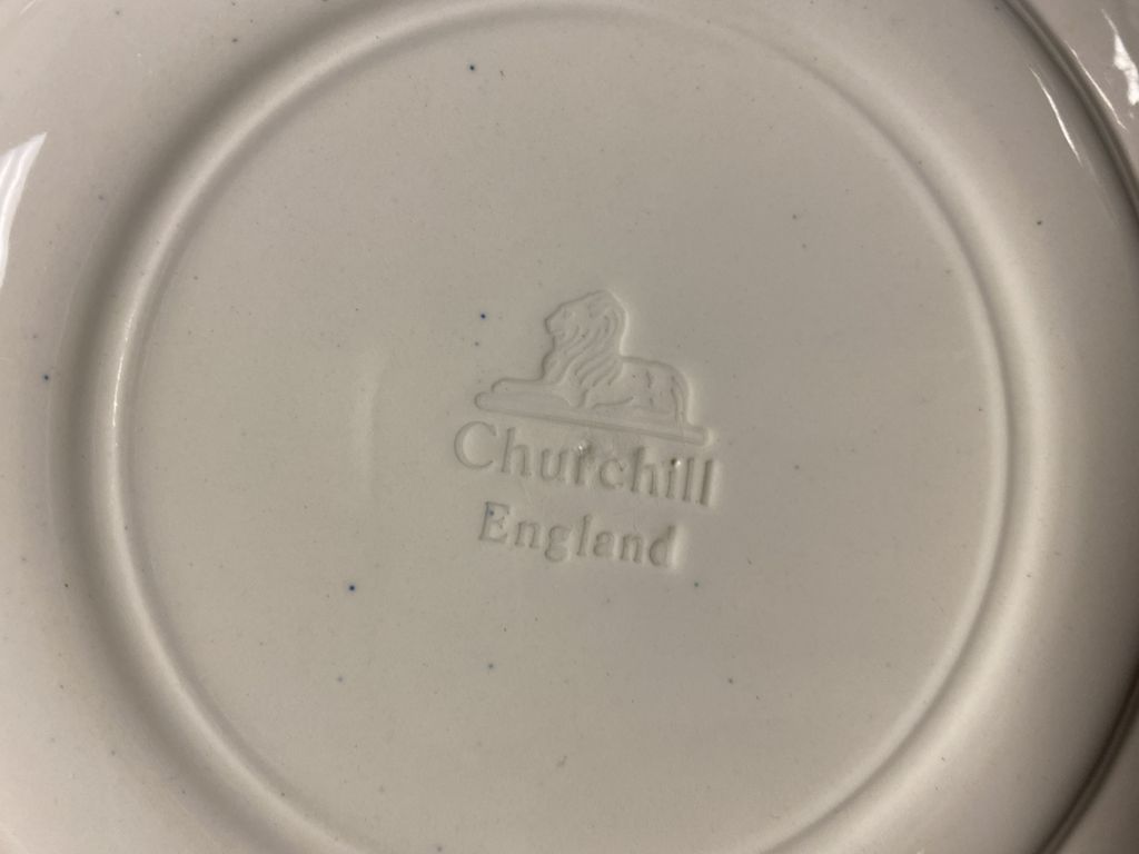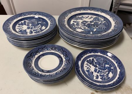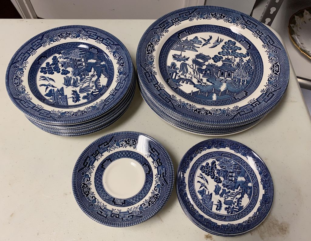 Group of Blue Willow Churchill Plates, 7 dinner plates, 8 salad plates, 5 saucers, bread & butter plates. Group of Blue Willow Churchill Plates, 7 dinner plates, 8 salad plates, 5 saucers, bread & butter plates.