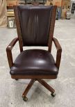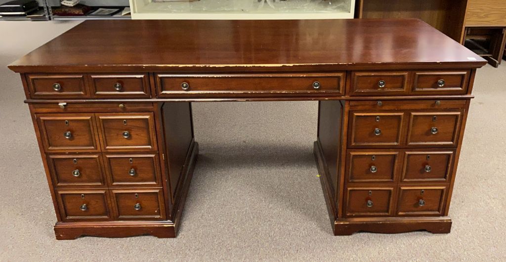 Bombay Cherry Kneehole Desk, 7 drawers, has finish wear on edges, 30"h., 65"w., 28"d. Included Desk Chair. Bombay Cherry Kneehole Desk, 7 drawers, has finish wear on edges, 30"h., 65"w., 28"d. Included Desk Chair.