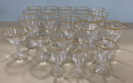 Fostoria Crystal Stemware, gold rimmed, marked Fostoria, 23 total pieces, needs cleaning. Fostoria Crystal Stemware, gold rimmed, marked Fostoria, 23 total pieces, needs cleaning.