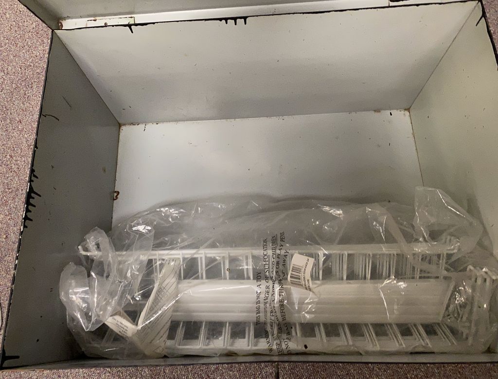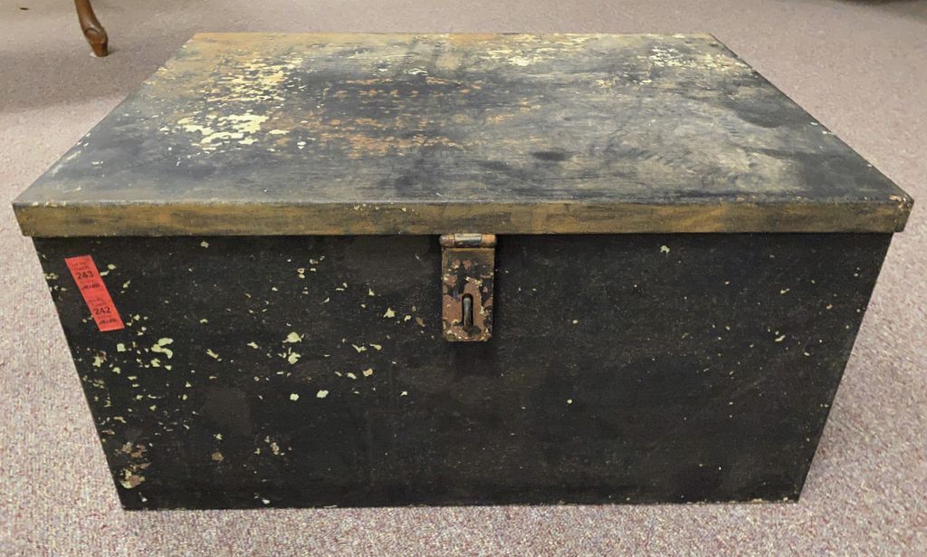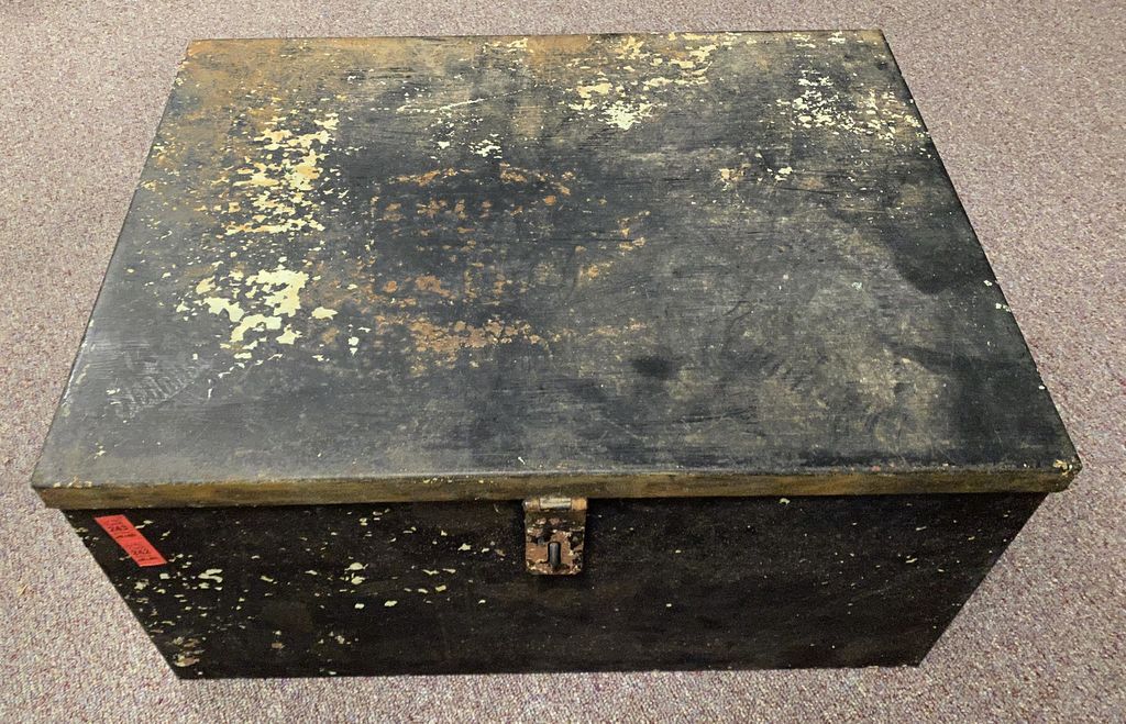 Vintage Metal storage trunk, lift top, worn condition. Vintage Metal storage trunk, lift top, worn condition.