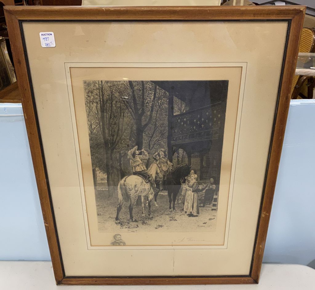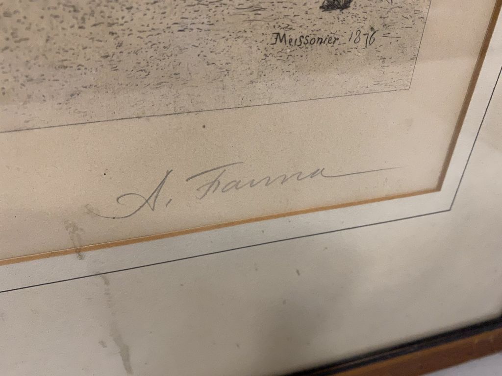 Meissonier 1876 Engraved Print, pencil signed by A. Fanna, matted, framed, 26"h., 20"w. Meissonier 1876 Engraved Print, pencil signed by A. Fanna, matted, framed, 26"h., 20"w.