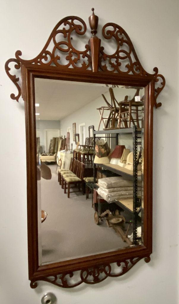 Baker Furniture Co. Chippendale Style Wall Mirror, beveled mirror, one piece needs repair, 53"h., 23"w. Baker Furniture Co. Chippendale Style Wall Mirror, beveled mirror, one piece needs repair, 53"h., 23"w.