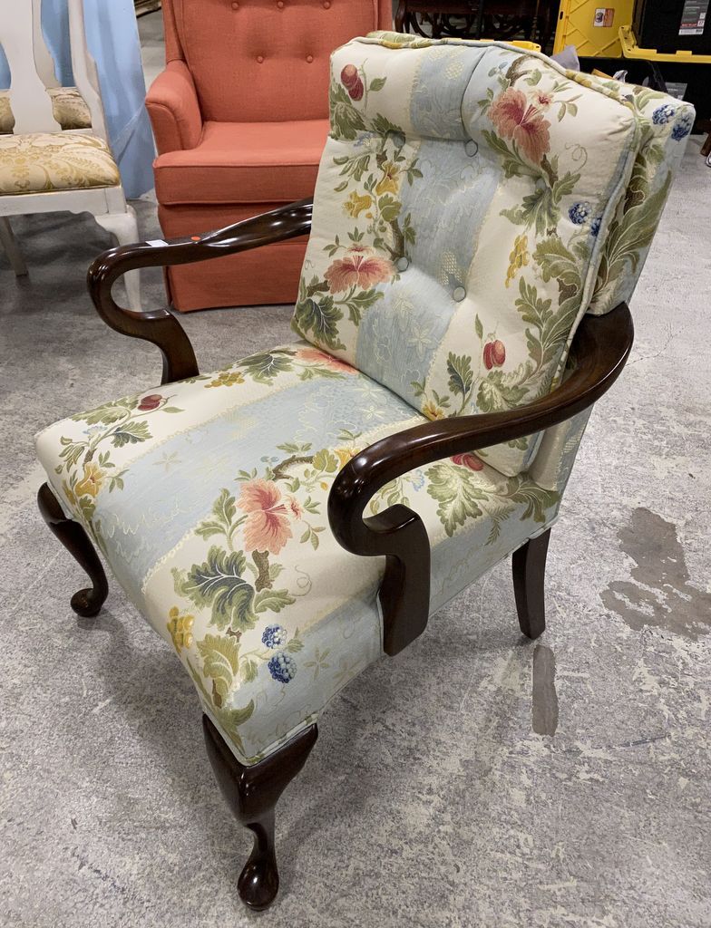 Cherry Queen Anne Upholstered Arm Chair, button tufted, floral fabric, clean, Late 20th century. Cherry Queen Anne Upholstered Arm Chair, button tufted, floral fabric, clean, Late 20th century.