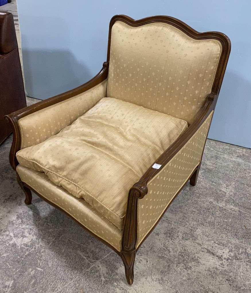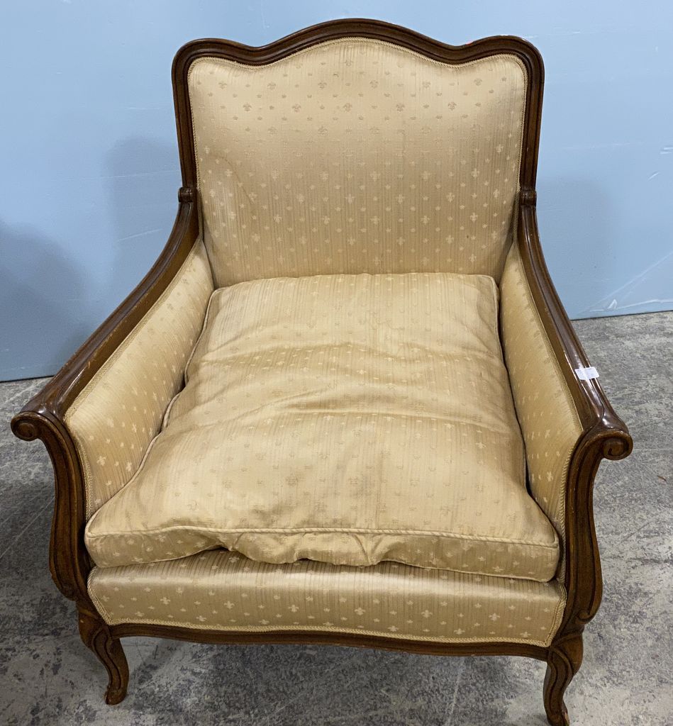 MGM French Style Arm Chair, mahogany, light wear, single cushion. MGM French Style Arm Chair, mahogany, light wear, single cushion.