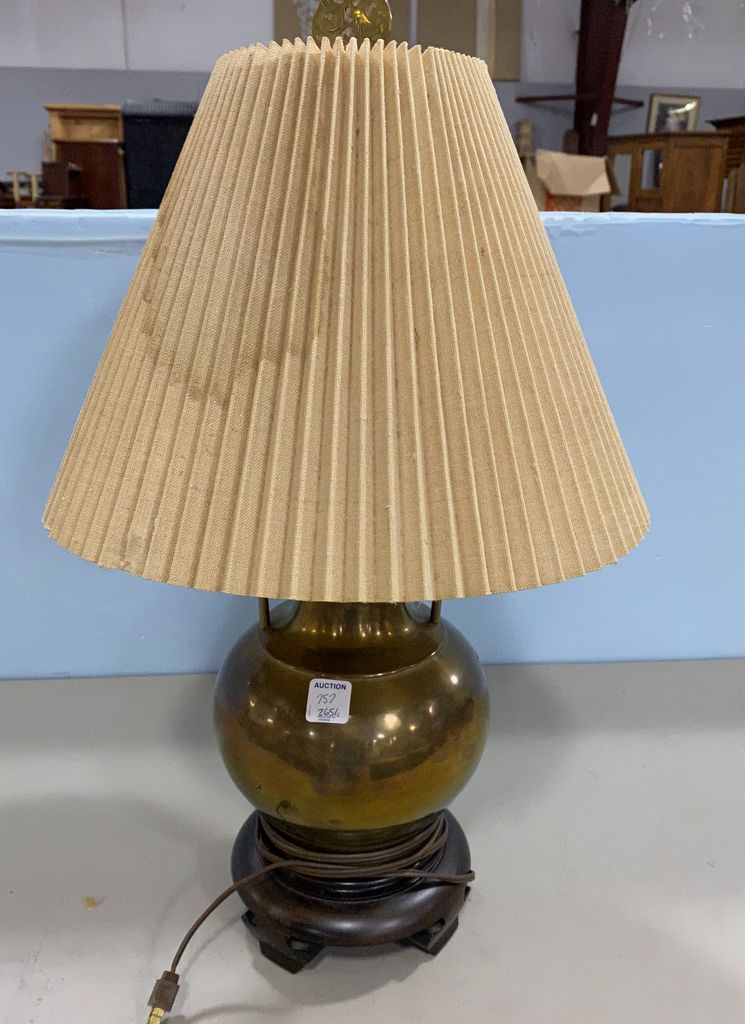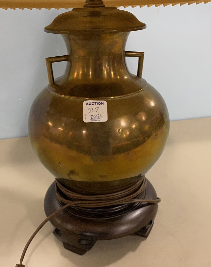 Mid Century Style Brass Vase Lamp, oriental wood base, with shade, 24"h. Mid Century Style Brass Vase Lamp, oriental wood base, with shade, 24"h.