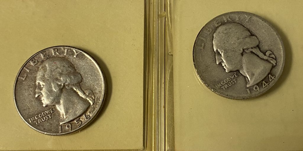 1956 and 1944 Washington Quarters, good, plastic case. 1956 and 1944 Washington Quarters, good, plastic case.