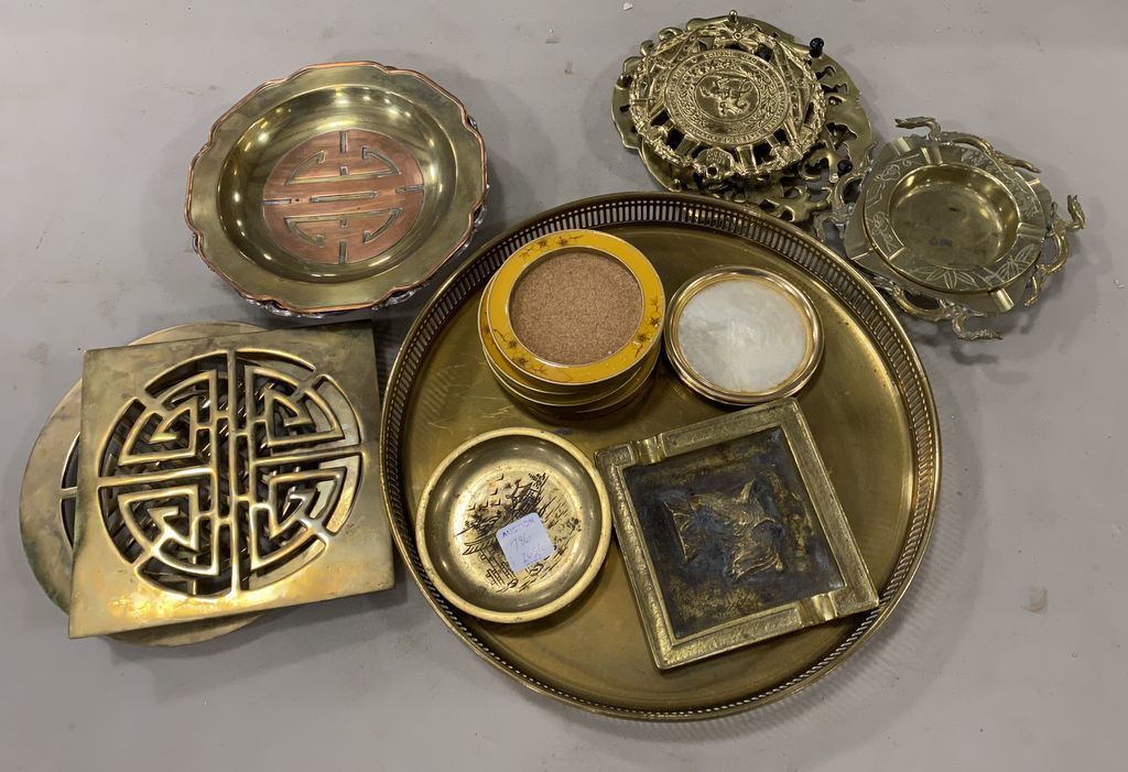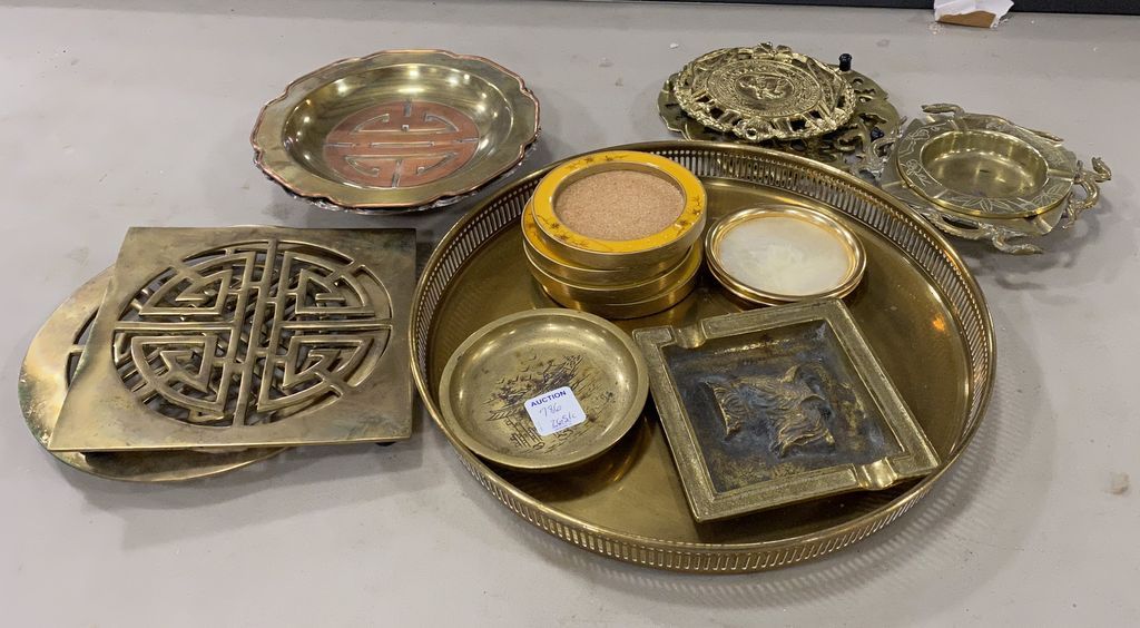 Group of Brass Decor, round tray, trivets, ashtray, coasters, vintage. Group of Brass Decor, round tray, trivets, ashtray, coasters, vintage.