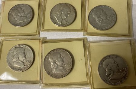 Four Franklin Liberty Bell Coins, 1951, 1962, 1958, 1962, 1961, and 1948, plastic case. Four Franklin Liberty Bell Coins, 1951, 1962, 1958, 1962, 1961, and 1948, plastic case.