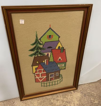 Vintage Farm House Needle Point, glassed, framed, 32"h., 22"w. Vintage Farm House Needle Point, glassed, framed, 32"h., 22"w.